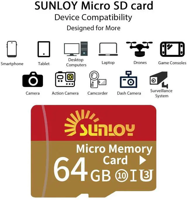 Storage: Sunloy high-speed TF cards feature Class 10, U3, V30, UHS-I, and A1 speed ratings delivering ultra-fast transfer speeds with exceptional stability. Perfect for storing games, high-resolution photos, recording and storing full HD/4K videos, and other data types. Its compatible with smartphones, tablets, cameras, GoPro/action cameras, laptops, desktop PCs, DSLR cameras, drones, Nintendo Switch, PlayStation Vita, and other portable gaming consoles