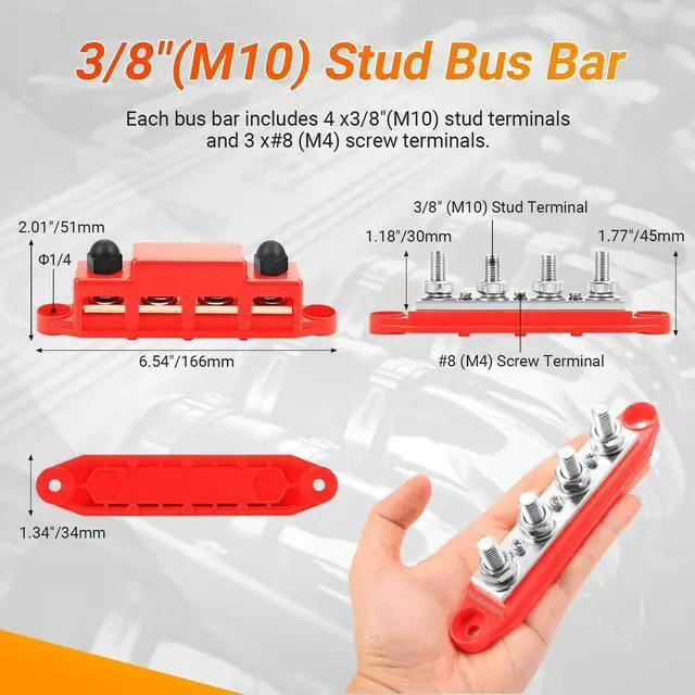Upgrade Design - Copper plates are held in place by large bolts instead of small screws, bus bar and base can withstand large torque, the entire busbar more stable and the busbar will not shake when unscrewing the nut. The small screw is centered, the wiring is more convenient to pass from the side, the wiring can also be staggered from other high-current wires. ^^ Specification - 12-48V red & black bus bar with screw: 3 x #8 (M4) terminal screws, 4 x 3/8 " (M10) terminal stud.