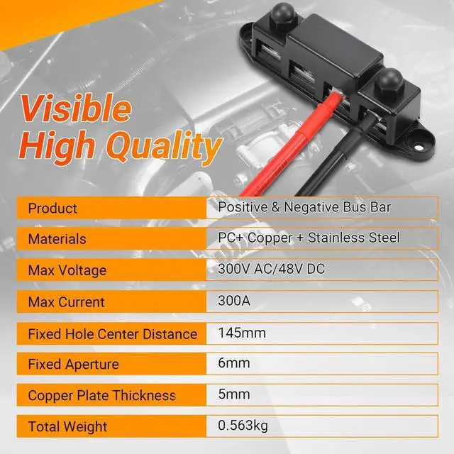 Weight: 0.563 kg. All the terminals of our bus bars are made of stainless steel, which will be less prone to rust compared to other Iron terminal busbar and can be used for a longer time. ^^ Heavy Duty - Power distribution block Max 300V AC or 48V DC voltage. The 4.0 mm copper bar is thicker than others' 2.0 mm brass busbar, and the 5mm copper plate is thicker than the other 3.0 mm copper plate and can withstand higher currents. ^^ Superior Quality - Nickle plated brass busbar plates offer low resistance, maximum conductivity, and corrosion protection, stability and the oxidation resistance, extend the service life. The nylon nuts connect to two external studs, removable Nylon busbar cover can cover exposed areas to prevent accidental short circuits. The insulated nylon base is flame-retardant, Superior Insulation & Strength. ^^ Wide Application - Bus bar is excellent for managing wires and distributing power, have plenty of connection points for both positive and negative wiring terminals, keep the circuit neat and orderly, make your wires doesn't look like a rat's nest under the hood anymore, reducing the possibility of short circuits.
