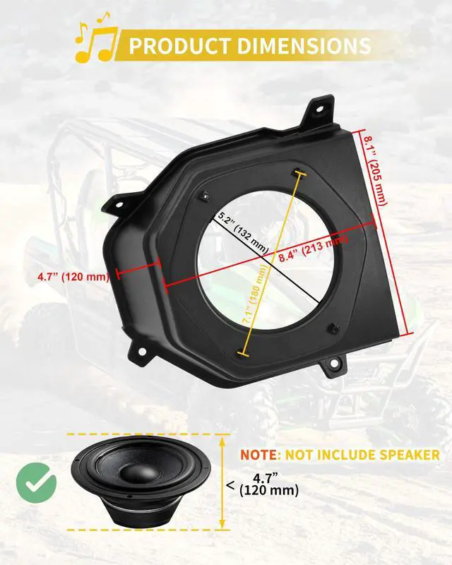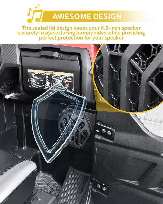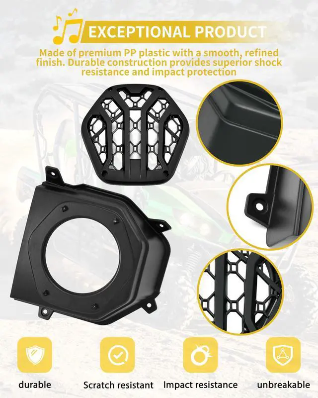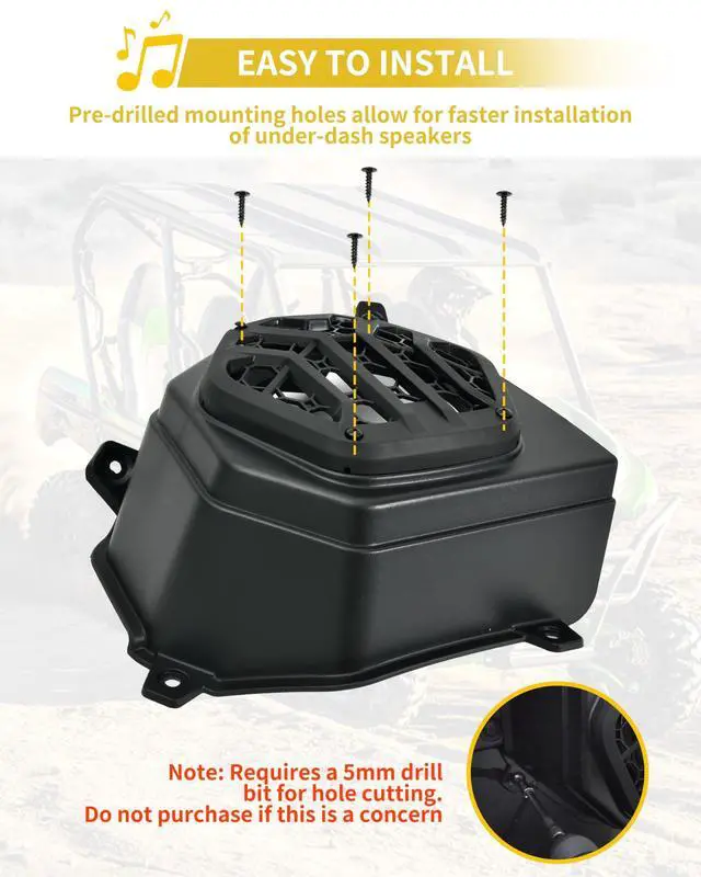 This under dash sppeaker pods fits for Kawasaki Teryx 800 / Teryx4 800 2016-2025 models. Please refer to the compatibility list in the description before purchasing. ^^ Unlike other speaker pods on the market, our under dash speaker holder features a cover that helps secure the speakers in place, preventing them from falling out, and effectively protects your 6.5 -inch speakers. ^^ This under dash speaker mount is made of high-density PP plastic, offering resistance to cracking, vibration, and wear. Its robust material withstands harsh outdoor conditions while maintaining structural integrity over years of use.