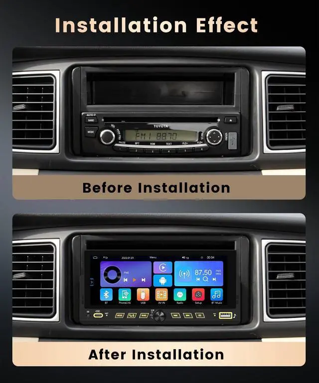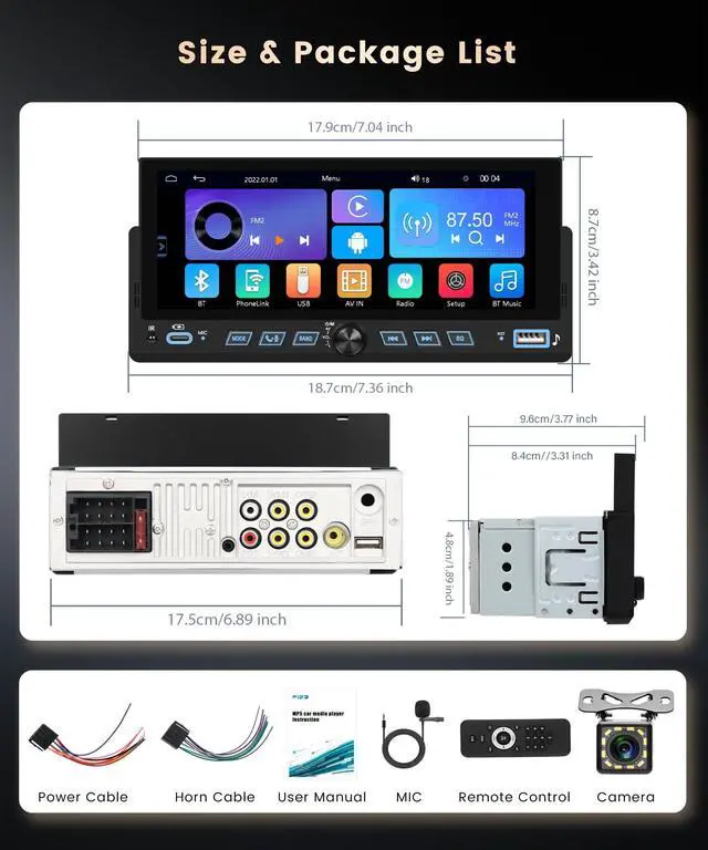 List: Single Din Car Radio x1RearView Camera (wiring harness included) x1MIC x1Power Cable x1Horn Cable x1Remote Control (AAA Battery is required) x1Manual x1