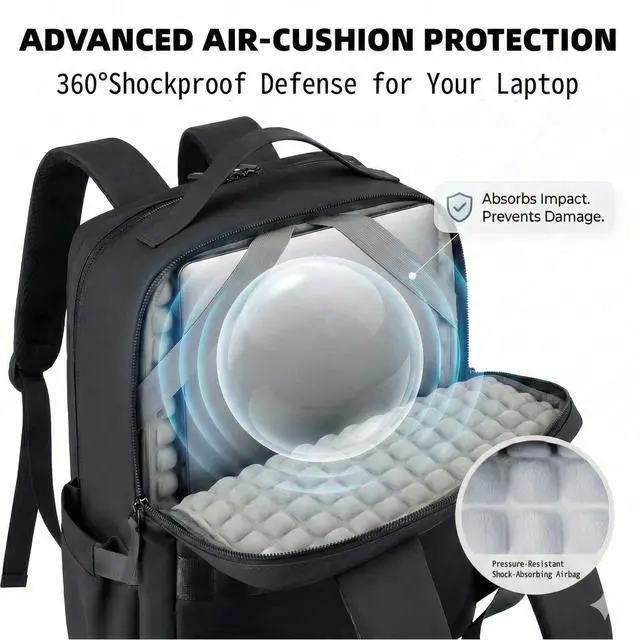 LAPTOPS: Worried about your tech on the go? The exclusive air-cushion padded sleeve safely cradles up to 17-inch laptops and tablets. Its shock-absorbing design protects your valuable electronics from bumps and drops during crowded daily work commutes or campus walks. ^^