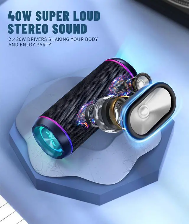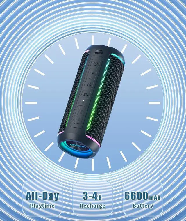 Powerful Sound: Get the loudest, massive Ortizan Original Professional Sound on our most powerful portable X30 speaker! Built-in premium tweeter and DSP digital chip, focusing on vocals and pop music; large orbit-shaped dual voice coil woofer with extended stroke, providing you with a broad low-frequency range. Dual passive radiators and a unique EQ sound effect can increase the speaker power up to 50W, minimize distortion, and enhance the bass in real time even at low volumes. ^^ 3