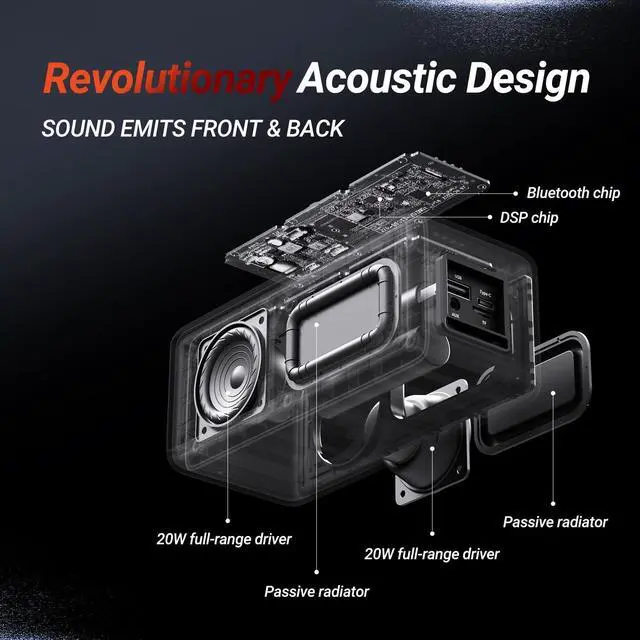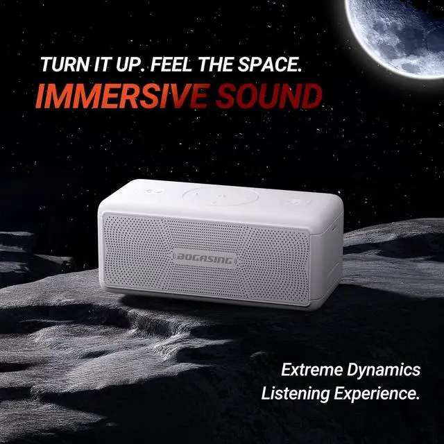 40W All-Around SoundM5 wireless bluetooth speaker is equipped with dual high-sensitivity drivers and dual passive radiators, pumping high-definition sound from all directions, bringing you an amazing 360 surround sound field, immersive Sound allows you have a deeper connection to your music. Simultaneously output BOGASING enhanced bass, get lost in the thundering bass, detailed mids, and crystal-clear highs. ^^ Three Audio SoundsBenefit from three sound effect modes of exclusive custom by BOGASING, which help you feel 3D Stereo, clear and undistorted vocals or powerful deep bass. Portable bluetooth equalizer speaker meet your listening preferences and provide you with more listening pleasure!! ^^ Fully WaterproofThe rated of IPX7 waterproof protection defends bluetooth speaker wireless against all kinds of dust, snow, downpours and spills, which is perfect for showering, hiking and camping.