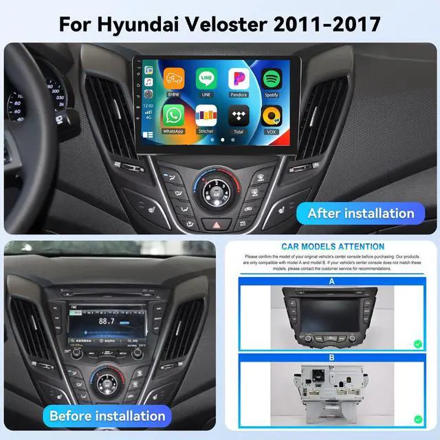 Revitalize Your Hyundai Veloster with an Android 15 TouchscreenUnlock modern tech in your 2011-2017 Hyundai Veloster with this advanced car stereo for Hyundai Veloster. Powered by Android 15, 4GB RAM, and 64GB storage, it runs navigation and apps smoothly for daily drives and weekend cruises. The vibrant 9-inch capacitive touchscreen (1280x720 HD) makes every map and menu pop, while multiple EQ presets let you customize sound for any music or podcast ^^ Wireless CarPlay & Android Auto Your Phone, On DisplayStay connected safely. This car radio for Hyundai Veloster supports wireless CarPlay and Android Auto.