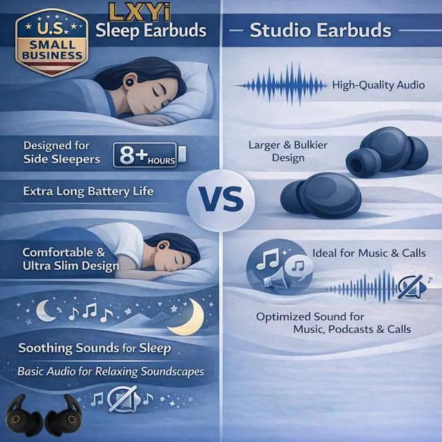 They are optimized for relaxing soundscapes that support rest, prioritizing a slim, low-profile fit for side sleepers and long battery life for all-night use, along with gentle, non-stimulating audio. Providing you a transparent and amazing customer experience is our top priority! **(iPhones: the "reduce loud sounds" setting on iPhone can impact sound quality for this product, please try disabling this option to maximize volume)**Small U. S. Based BrandThank you for supporting our small U. S. business based out of our hometown in Florida. We truly value and care deeply about our customers. Our mission is to bring peace and tranquility to your nightly routine. Thank you for shopping with us! Designed for All SleepersSide-sleeper fit approved. Ultra-thin 5 mm SF-E cushion and featherweight 2.7 g per earbud make LXYi buds vanish on the pillowside, back, or stomachwithout morning ear pressure. Block the Night (28 dB Noise Blocking) Snoring, traffic, roommates, pets, neighborsturned down. Enjoy 28 dB passive noise isolation that seals in calm and seals out distractions, no active noise canceling required. All-Night BatteryYou expect sleep earbuds that last all nightso do we. Up to 8 hours per charge (up to 24 hours with the case) to carry you from lights-out to wake-up. Battery life varies with volume and content. No Alerts, No BeepsTired of hearing Connected, Battery Low, or worseBATTERY LOW while youre trying to rest? LXYi says no.