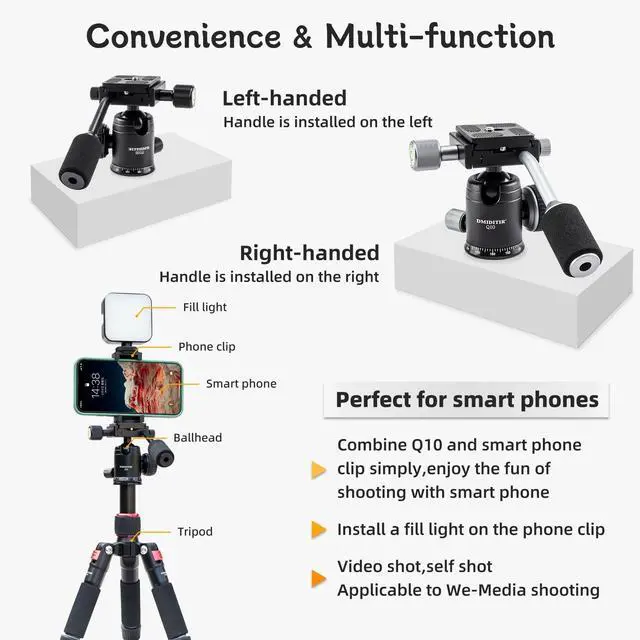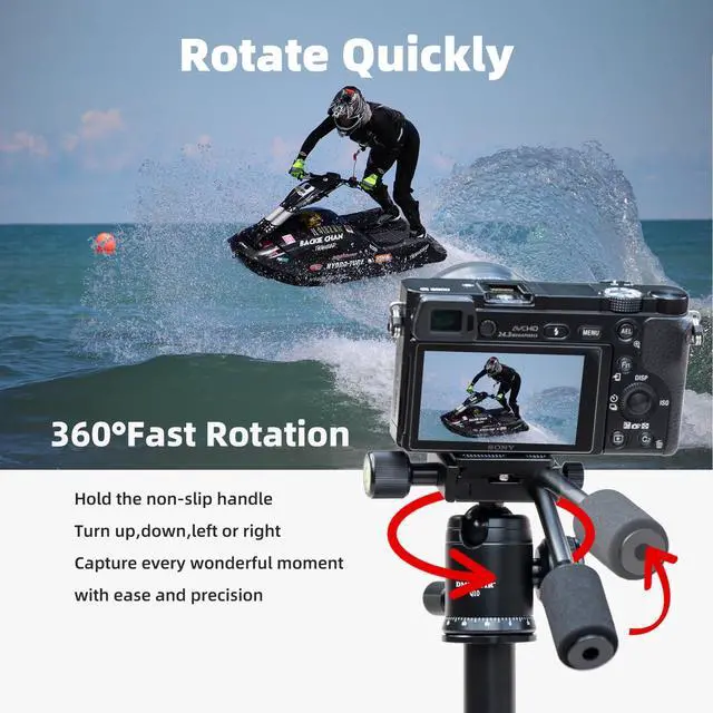 Panoramic Ball Head with 360 rotation: The ball head can be rotated 360 horizontally or vertically, allowing you to easily adjust the angle of your camera or smartphone. This is especially useful for taking panoramic photos, group photos, and landscape photos.