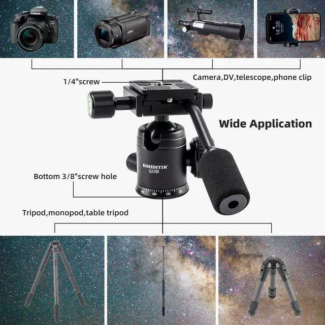 ^^ Multiple uses: The panoramic ball head is suitable for various devices, such as tripods, monopods, DSLR cameras, camcorders, DV cameras, telescopes, and hunting cameras. It can be used in indoor or outdoor photography, video shooting, and more.