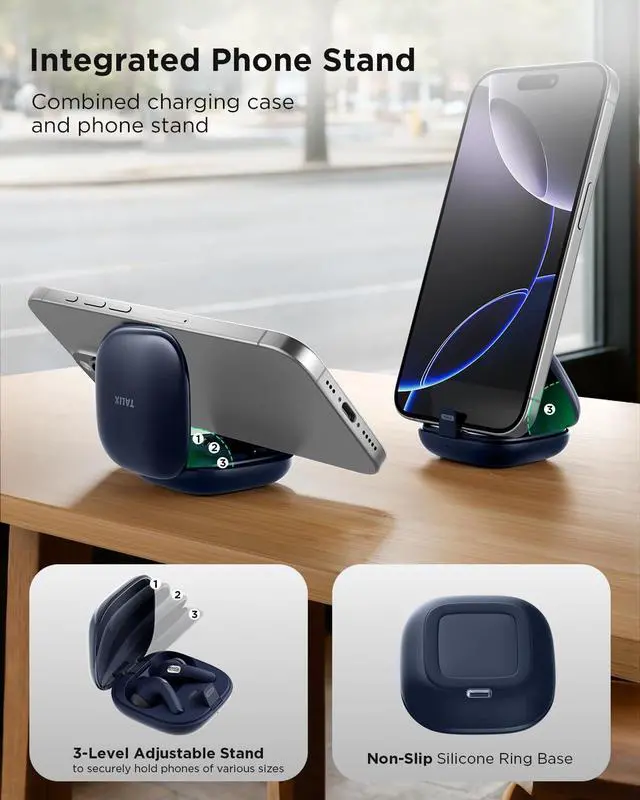 Punchy Bass Featuring 10mm titanium-composite diaphragm drivers, TALIX T30 noise-cancelling earbuds deliver punchy bass and vibrant sound: enhanced low-frequency performance and a deeper, more powerful listening experience ^^ Integrated Phone StandTALIX T30 wireless earbuds charging case doubles as a hands-free phone stand with 3-level adjustable and a non-slip silicone ring base, securely holds phones of various sizes. Making it perfect for watching videos, video calls, and entertainment on the go ^^ Powerful Noise CancellationAdvanced active noise cancelling helps block out a wider range of distracting noises, letting you focus on your music. Enjoy a more immersive and balanced listening experience, whether you're commuting, working, or relaxing ^^ 4-Mic Clear Calls Equipped with a 4-mic noise reduction system, TALIX T30 wireless headphones enhance voice pickup while filtering background noise for clear, natural conversations. Whether on calls or video chats, your voice comes through with clarity ^^ Comfort & Secure Fit Ergonomic curved design ensures a snug, secure fit and all-day comfort. Optimized using millions of facial scans, TALIX T30 Bluetooth earbuds stay stable during workouts and are comfortable for commuting, travel, and everyday wear ^^ Latest Bluetooth Version 6.0 TALIX T30 wireless Bluetooth headphones use the latest Bluetooth 6.0 for faster pairing, stable connectivity, and lower power use.