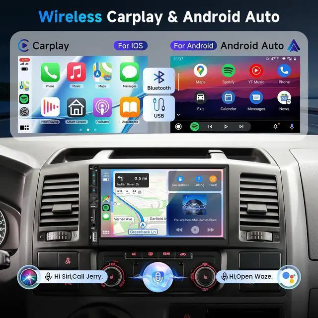 Android Auto: Our double din touch screen car stereo offers wireless CarPlay and Android Auto. Connect your iOS or Android device easily via Bluetooth or USB Cable. It also support voice assistant through carplay ^^ Upgrade Bluetooth 5.0 /FM
