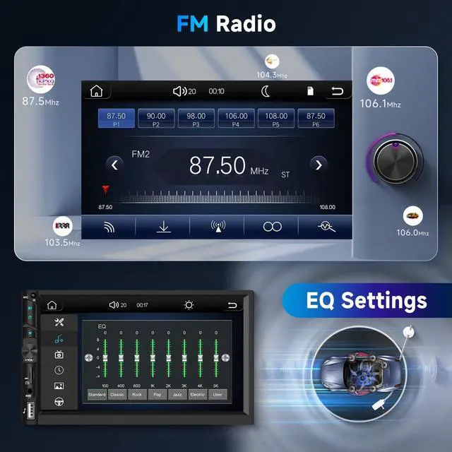 Radio/ EQ: This double din car stereo comes equipped with Bluetooth 5.0, it allows forhands - free calls and smooth music streaming. With built - in FM radio, you can listen to news, music, or weather forecasts. The EQ settings allow you to customize your music style for an enhanced listening experience ^^ 7- inch HD IPS Touchscreen with