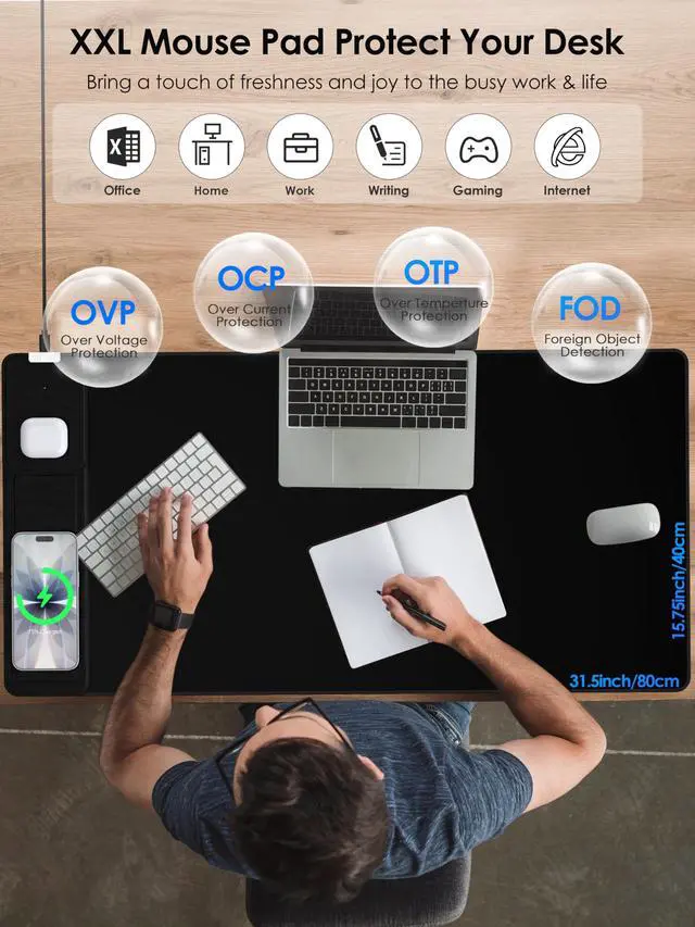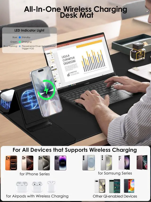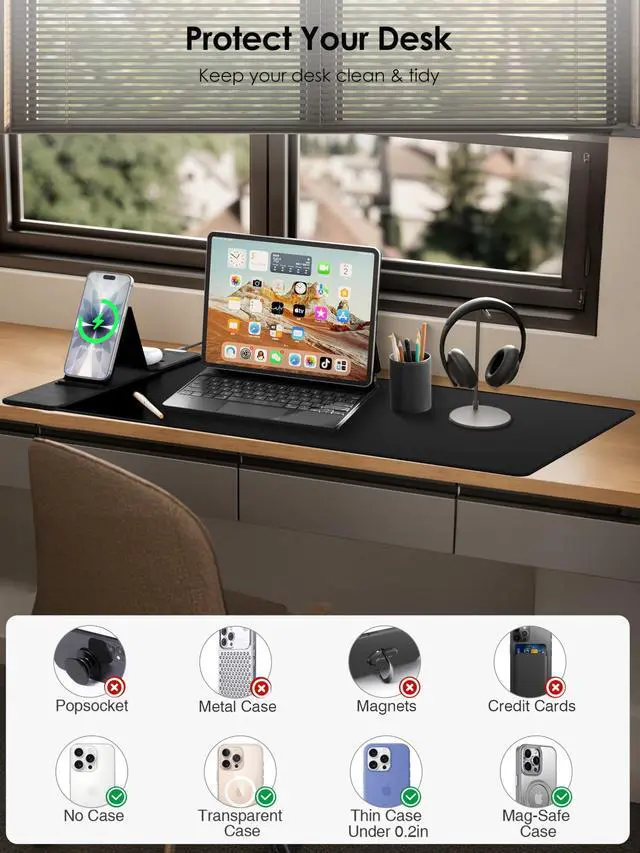 All-in-One WorkstationTransform your workspace with this massive 31.5" x 15.75" desk mat. It combines a premium gaming mouse pad with a 3-in-1 wireless charging station, eliminating cable clutter. Charge your iPhone, Samsung Galaxy, and Air-Pods simultaneously on the dedicated left-side charging zone while you work or game. The built-in, foldable phone stand keeps your device visible for easy access to notifications, video calls, or streaming. ^^ Rapid Mag-Safe & Qi ChargingExperience the convenience of true magnetic snap-and-charge technology. This pad is Qi-certified and equipped with a powerful magnetic module that securely locks your iPhone 17, 16, 15, 14, or 13 into place for a perfect charge every time.