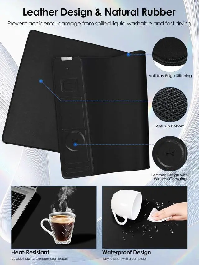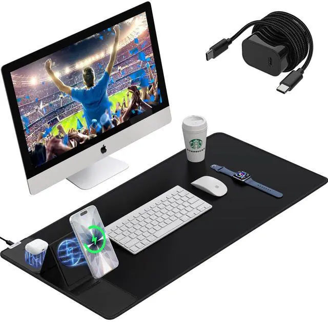 Deliver high-speed 15W charging to compatible devices like the iPhone 17 Pro Max, Samsung Galaxy S25/S24/S23, and Google Pixel. ^^ Smart Dual-Zone Charging with Versatile Viewing StandNever miss a charge with dedicated power zones. Place your Mag-Safe phone on the primary zone, and set your Air-Pods Pro 2, Air-Pods 4 ANC, or standard Qi earbuds on the secondary pad to charge simultaneously. The adjustable stand offers two flexible modes: lay it flat for a clean desktop look, or prop it up vertically for the perfect viewing angle during FaceTime calls, watching TikTok, or following recipes. ^^ Optimized for Precision Gaming & ProductivityBuilt for performance, the high-density micro-woven fabric provides the perfect friction balance for flawless glidingideal for both high-DPI gaming mice and precise office work. Worried about coffee spills or messy desks? The rugged, waterproof surface is stain-resistant and easy to clean; simply wipe it down with a damp cloth to keep it looking brand new. ^^ Durable Stitch-Bound Design & Non-Slip Rubber BaseBuilt for the long haul, this desk pad features reinforced stitching along the edges to prevent fraying, peeling, or warping over time. The textured non-slip rubber backing grips your desk firmly, ensuring the mat stays perfectly in place during intense gaming sessions or frantic typing. The package includes a durable 6.56 ft braided USB-C cable and is backed by a 24-month warranty.