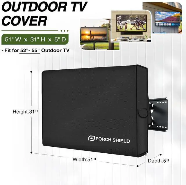 Dimension - 51L x 31H x 5D inch. Suitable for 52-55 inches LCD, LED and Plasma Flat TV Screen with cables. ^^ Upgrade Function - Zipper on the bottom delivers 360 full protection and rear cover shield expanded provides more protection for TV back, Especially on rainy day. ^^ Material - Made of 600D oxford with waterproof coating and seam sealing taped. Heavy duty fabric make outside TV cover good performance of dustproof, waterproof and weatherproof to against severe weather and soft inside fabric can't scratch your TV. ^^ Mount Compatibility - Back Velcro strip instead of back zipper.
