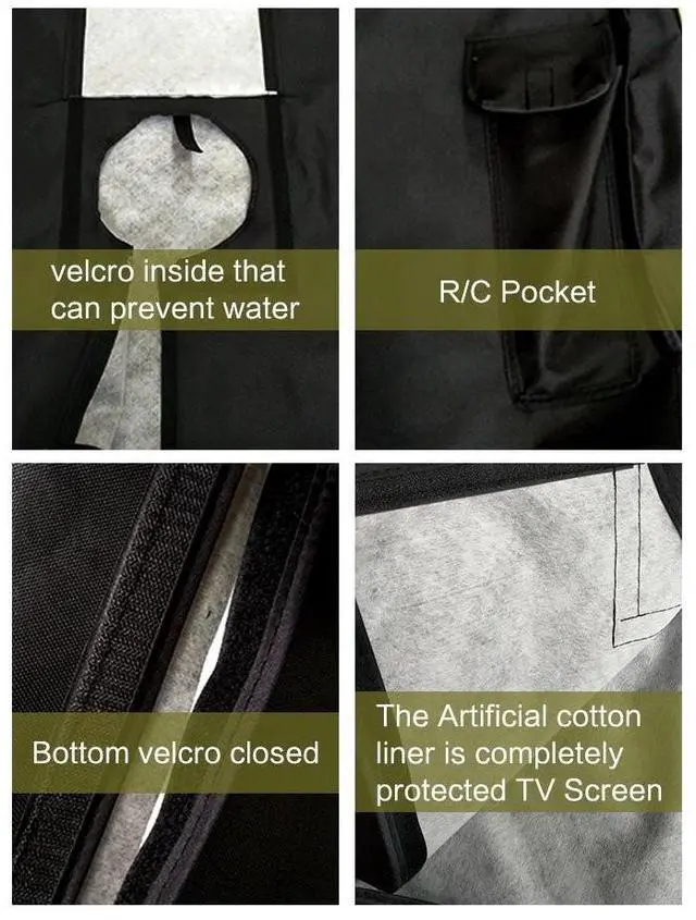 ^^ NEW DESIGN: You can roll the front tv cover up and watch TV, The front two transparent PVC can prevent the cover dragging down. NEW DESIGN OF BOTTOM SEAL -360 degrees protection, The BOTTOM hook and loop fastener can provide the maximum coverage against water. Hook and loop fastener inside is designed to prevent the water from leaking into the back, The REMOTE CONTROL POCKET facilitate storage of your remote control.