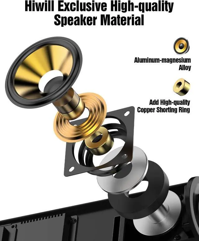 (Note: DTS decoding is not supported. ) ^^ 4 Alloy DiaphragmDrivers Crafted with cutting-edge aluminum-magnesium alloy diaphragms, the drivers combine lightweight strength to enhance audio performance with exceptional sensitivity and durability. The home audio sound bars driver elevates your audio experience with 20% deeper bass and 30% clearer highs compared to traditional paper drivers while ensuring pristine vocal clarity. This soundbar for TV allows you to hear every word with unmatched precision, whether its dialogue in movies or lyrics in your favorite songs. ^^ HXS-Processing ClearVoiceUnveil unparalleled audio precision with Hiwill exclusive HarmonicX Sound Processing(HXS-Processing). This exclusive technology optimizes the audio output by enhancing vocal clarity and refining every sound detail, ensuring crystal-clear dialogue, immersive surround sound, and a richer overall listening experience. Whether it's movie dialogue or music, HXS-Processing ensures each sound is brought to life with exceptional clarity and depth. ^^ 5.25" Wired Subwoofer with Bass EnhanceableElevate your sonic adventure with our BIGGER 5.25 -inch external wired subwoofer. Feel the power of deep, resonant bass that will shake your room. The TV sound bar with subwoofer larger driver and freer diaphragm movement delivers a wider and deeper sound field compared 4" subwoofer.