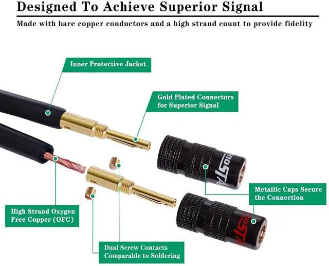 HIGH QUALITY SPEAKER CABLE - InnoStars 14 gauge banana plug speaker wire is made from 99.99 % oxygen free copper speaker cable with speaker plugs. In wall CL2 rated premium banana plug wire cable designed for home stereo, speaker, subwoofer, center channel speakers, sound systems, bi-wiring or bi-amping. ^^ DUAL BANANA PLUGS SPEAKER CABLE - The double banana plugs for speaker wire are dual screws with closed screw design, 24K gold plated, and corrosion resistant with premium high strand count wires for highest clarity, sound accuracy, and low signal distortion.