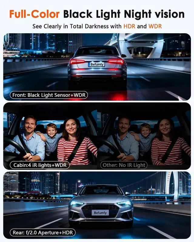 Black-light Night Vision Clarity: With advanced IR night vision + WDR tech, the dash cam front and rear inside ensures clear footage even in low-light environments. Capture license plates and interior scenes during the night or in tunnelsnever miss key details, day or night.