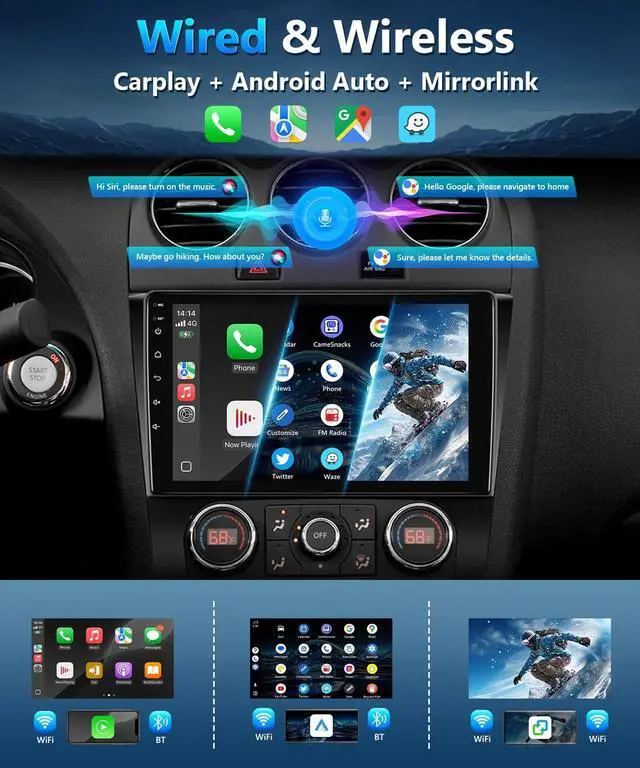 Private Car Cinema: 3 Ways to Connect - This apply CarPlay radio can transform your cabin into a mobile theater with Wireless CarPlay, Android Auto, and MirrorLink. Bored while waiting to pick up kids? Use the radio stereo screen to watch movies or videos while you wait with build in Netflix, then head home with real-time GPS navigation using this aftermarket radio upgrade ^^ DSP Audio, FM & Split-Screen - Sound quality of the Altima radio head unit is noticeably better than stock, especially with customized DSP & EQ tuning; Bluetooth audio and call quality of the radio receiver are crystal clear. Enjoy sharp local FM/RDS stations and efficient split-screen multitasking to view navigation and music apps side-by-side ^^ Triple
