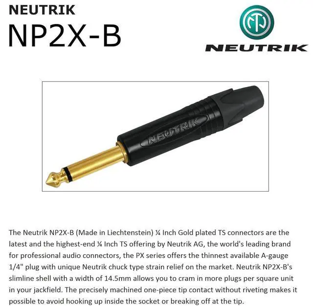 These high-value, high-quality cables will not break your bank and the integrity of your creative process. With WBC-PRO you are buying a product made with love and the utmost care for quality. WBC-PRO, the only cable you will ever need! ^^ These inch Gold plated TS plugs are made by Neutrik AG- Liechtenstein, the world's leading brand for professional audio connectors. NP2XX-SILENT uses hermetically sealed switching contacts to quietly switch the instruments under load, thereby avoiding annoying thumps, pops and squeals. This & NP2X-B both sport slimmer shells, precisely machined one-piece tips & offer greater reliability, improved contact integrity and reduced cable strain.