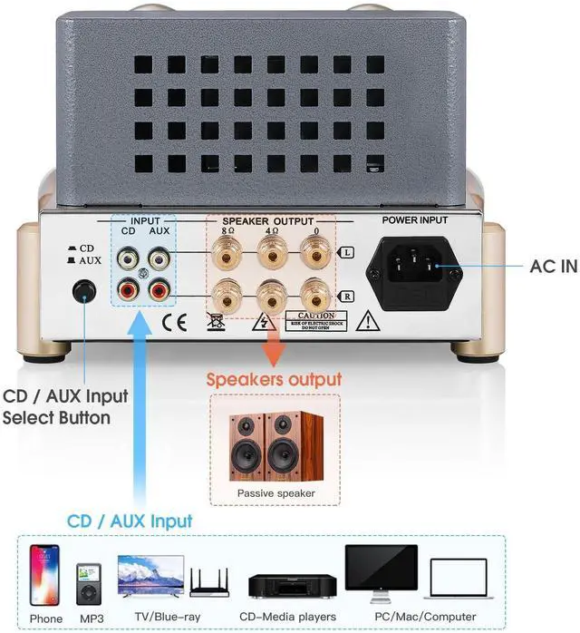 ^^ Universal Compatibility: The F5 amplifier is equipped with dual stereo RCA inputs, allowing seamless connection to a variety of audio sources, including phones, tablets, TVs, and CD players, with an input selector for easy switching.