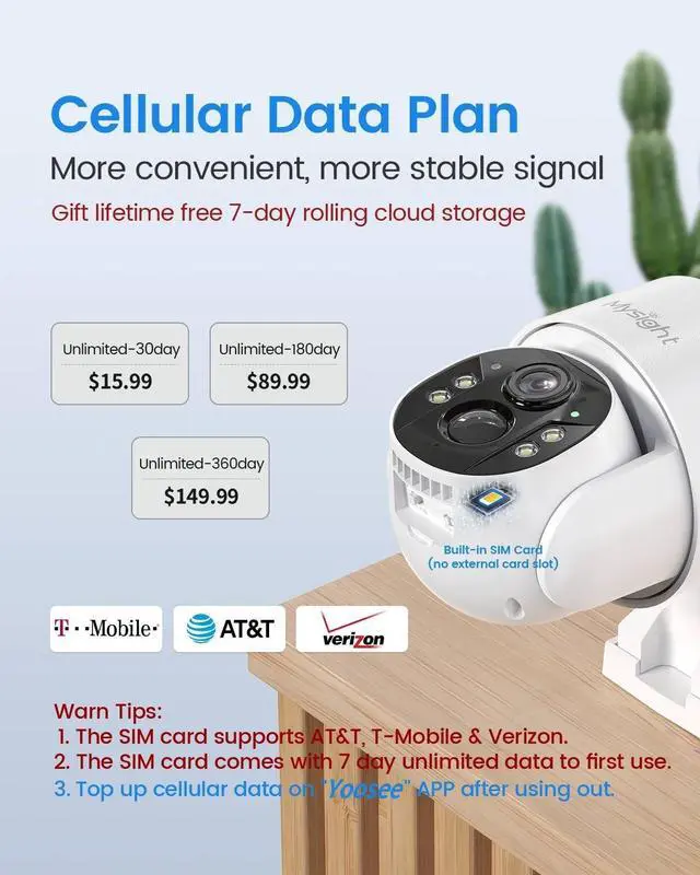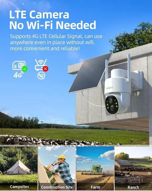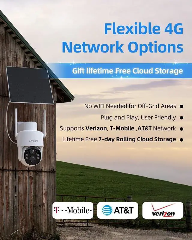 Ideal for Places without WiFi & Electrical PowerThis 4G LTE cellular security camera is 100% wired-free and can work without WiFi even wire. Making it ideal for barns, farms, ranches, construction sites, vacation homes, warehouses, and RVs. Additionally, it has weather-resistant with an IP65 rating which are designed to withstand diverse environments (Wi-Fi connection is not supported) ^^ Inculdes SIM Card & Lifetime Free 7-day Rolling Cloud Storage No wifi security camera supports 4G LTE networks from Verizon, T-Mobile, and AT&T while including a 4G LTE SIM card with 7 day 300M trial data to first use.