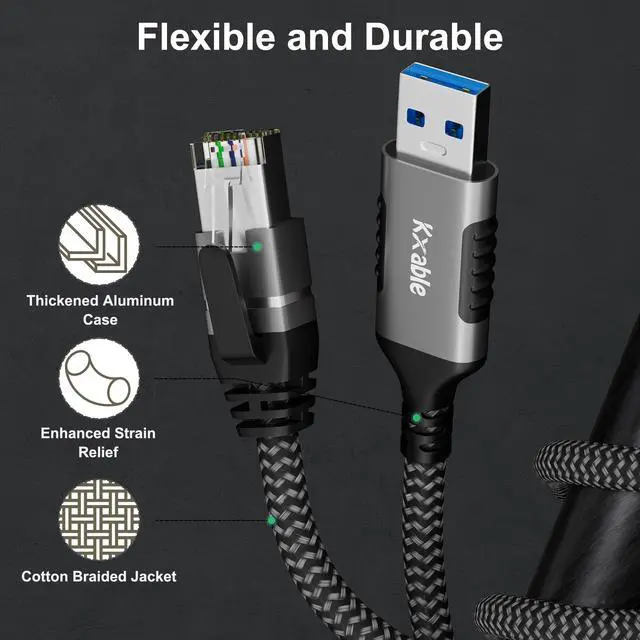 Ethernet CableA novel solution: no need to connect through a combination of USB A to RJ45 adapter and internet cable. Premium BuildData transmission speed of up to 1000Mbp. Oxygen free copper wires. Premium aluminum shell. Anti-rupture SR (strain relief) and bicolor nylon braided jacket. Wide CompatibilityCompatible with Windows, Mac OS, Chrome OS, and Linux. Suitable for most desktop PC, Laptop, Nintendo Switch, Switch Oled and TV Boxes with USB A port, such as MacBook Pro 2015/2017, Mac Mini, ThinkPad, Surface, XPS, Chromebook, Spectre, Zenbook and More.