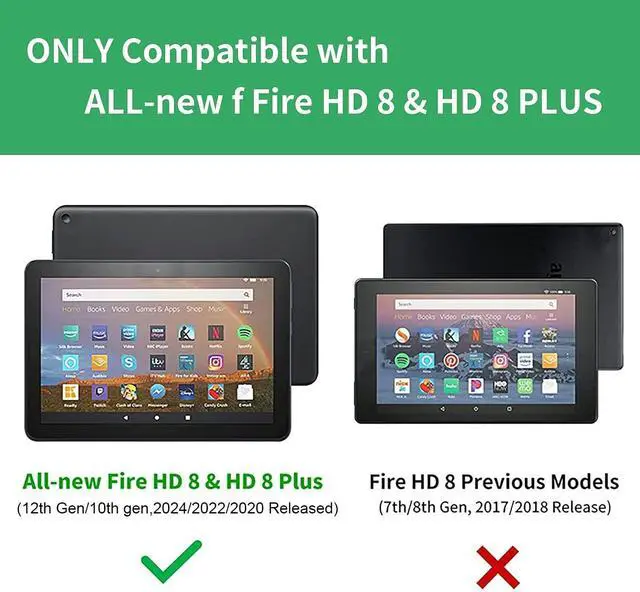 CompatibilityDesigned only for Fire HD 8 tablet & Fire HD 8 Plus Tablet (12th/10th Generation, 2024/2022/2020 Release), NOTE: Not compatible for kindle fire hd 8 table(6th/7th/8th Gen-2016/2017/2018 Release)or any other tablet modles. Please check your device before purchasing ^^ Adjustable StandThis foldable cover with anti-slip lining securely prop your tablet in horizontal. Effortlessly multiple angles adjustable for hand-free video calls, watching shows, following recipes Enjoy total convenience and a perfect view every time ^^ Intelligently Sleep/WakeBuilt-in magnetic for the fire HD 8 case (2024/2022/2020 Models), Ensure instantly wakes up your tablet when opened, and makes it go to sleep once closed, saving power and extending battery life. No need buttonsjust pure convenience ^^ Slim Hybrid ProtectionThe Durable TPU shockproof inner case combined Soft PU leather cover fully wraped your tablet to protect from daily wear, bumps, scratches and accidental falling, Designed for the fire 8 12th gen case to be sleek and portable, only minimal bulk while maximizing protection ^^ Perfectly FitFlexile TPU case snug fit your kindle fire HD 8/8 plus 12th/10th gen, All cutouts are lined up, Easy to access to all feature (camera, spearker, ports and buttons) without removing the protective case