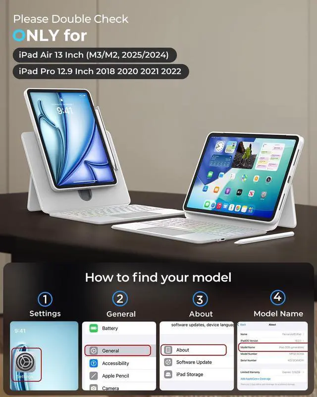 Broad Compatibility: This keyboard case is meticulously designed to fit the iPad Air 13 - inch (M3) 2025 (A3268/A3269/A3271), iPad Air 13 - inch (M2) 2024 (A2898/A2899/A2900), iPad Pro 12.9 - inch 6th Gen 2022 (A2436/A2437/A2764/A2766), iPad Pro 12.9 - inch 5th Gen 2021 (A2378/A2379/A2461/A2462), iPad Pro 12.9 - inch 4th Generation 2020 (A2229/A2069/A2232/A2233), and iPad Pro 12.9 - inch 3rd Generation 2018 (A1876/A2014/A1895/A1983). Please note that it is not compatible with the iPad Pro 13 - inch (M4) 2024 and other tablets. To ensure a perfect fit, kindly check your tablet's model number before purchasing. ^^ Adjustable Stand & 360