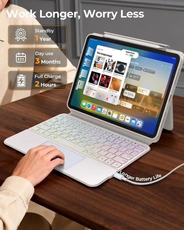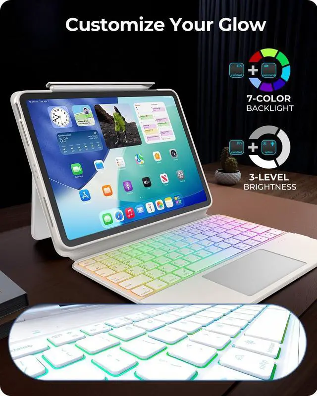 Backlit Pro Design: Navigate the iPad like a pro with the high - precision multi - touch trackpad that supports native iPadOS gestures. She can swipe, scroll, and switch between apps with intuitive ease, significantly boosting her workflow. The classic black keyboard design strikes a perfect balance between business - like sophistication and personal customization. With 7 adjustable backlight colors, she can use it in dimly lit settings without straining her eyes or add a touch of flair to her workspace to make it truly her own.