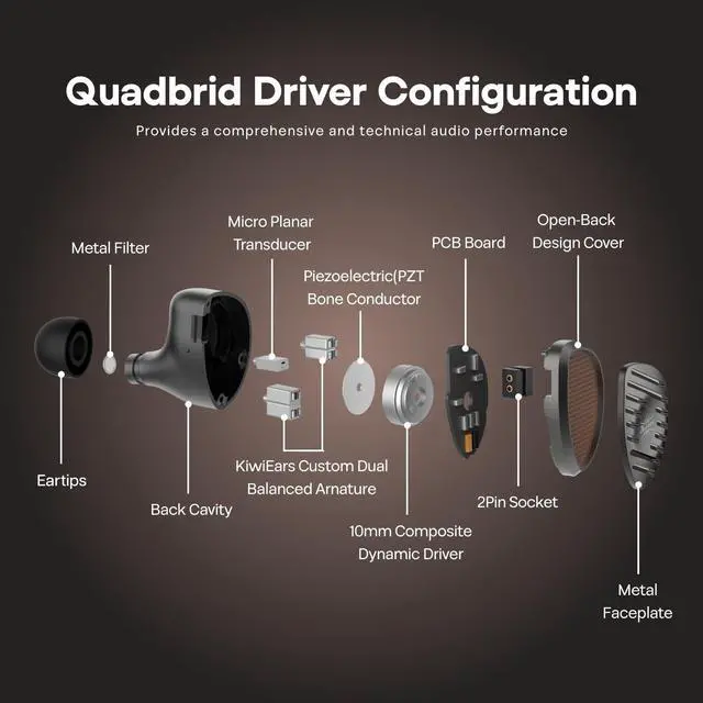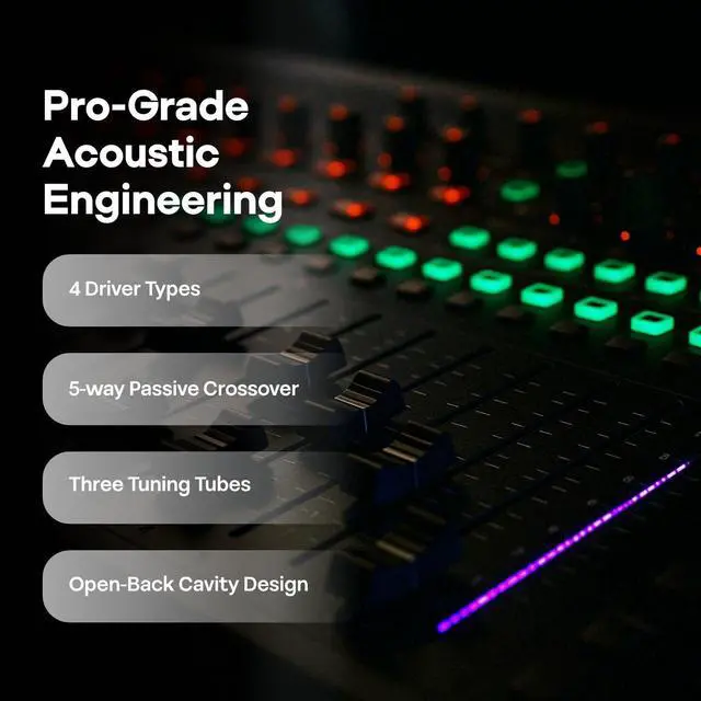 ^^: Four balanced armature drivers have been selected to power the low-mid and mid-treble frequencies on the Septet. Balanced armature drivers offer an articulate, accurate, and detailed sound due to their speed, providing a studio monitor-like precision to your music. Two independent crossover networks are utilized across the four drivers, dedicating each channel specifically across the low-mid and mid-treble range for a complete coverage across the entire frequency range while minimizing harmonic distortions.