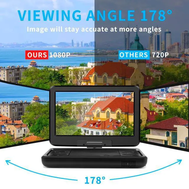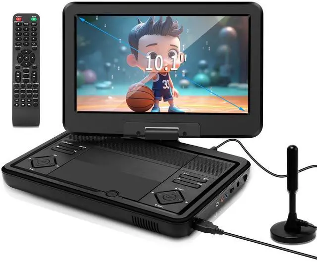 HIGH-RESOLUTION IPS SCREEN: 10.1 inch DVD & TV portable player HD screen with 270 rotation and 180 flip function give you to watch a movie or cartoon clearly from each angle, giving you a excellent visual experiencea, the body is compact and easy to carry. Built-in two high-power speakers, which makes the volume louder and clearer.