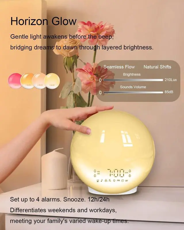 It also offers sunset simulation: set a 5-180 minute countdown, and light/sound will fade slowly to create a calm vibe, relaxing your mind and body for better sleep. ^^ Versatile Sound Modes Choose from 7 built-in natural sounds (bird chirps, ocean waves, rain, lullabies, etc. ) with 20 volume levels. It also has an FM radio (76-108 MHz) for your favorite stationsuse radio sounds as your alarm too. Plus, connect your phone to play your own music for more flexibility. ^^ Vibrant 11-Color Night Light With 11 color options, this clock works as a night light, bedside lamp, reading light, or mood light. Adjust color and brightness to match your needscreate a cozy, romantic ambiance for your bedroom. ^^ Dedicated Customer Support We value your experience. If you have any issues after purchase, contact our after-sales team via email. Well respond promptly to provide a satisfactory solution.