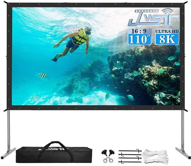 Easy to Set UP The projector screen with stand 110" is ready for quickly set-up in few minutes. Just press the metal snaps around the portable frame to quickly fasten the projector screen to the one-piece frame flatly, detachable legs can be assembled easily with no tools required. ^^ Convenient to CarryThe projector screen made by lightweight but sturdy aluminum, the portable movie screen frame can be easily transported to anywhere with included soft padded carrying bag and be well protected. The 110" outdoor movie screen folds super compactly than most 4K HD projector screensthat make it easy to travel along with for family trips, camping, or backyard movie night ect.
