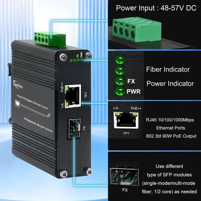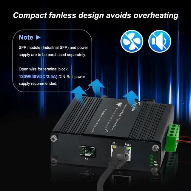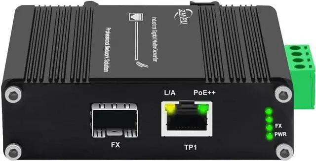 [IEEE 802.3 af/at/bt PoE Standard]The Industrial PoE++ Media Converter complies with IEEE 802.3 af/at/bt standard, and it can automatically detect the powered supply. ^^ [Auto Sensing 100/1000Base-FX] The open SFP port of fiber media converter supports both 155Mbps and 1.25G SFP module. You can use your device with 100M or 1000M fiber port freely. ^^ [48~57V DC Power Input] The media converter supports 48~57V dual backup voltage DC input and only need one group of power supply to be connected to work. ^^ [Good Quality]The PoE++ Ethernet media converter supports Auto-negotiation, full Duplex or half Duplex, Auto-negotiation, Complies with IEEE 802.3 / 802.3 u/ 802.3 z/ 802.3 ab.