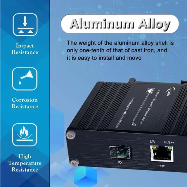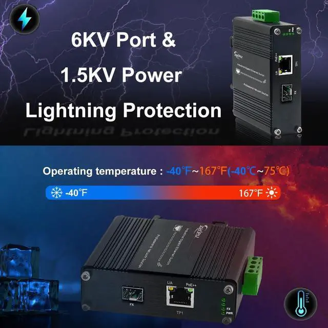 ^^ [Aluminum Housing]The Ethernet media converter uses industrial IP40 aluminum housing, having 6KV lighting protection and can work at wide range temperature -40C to 80C (-40F to 176F).