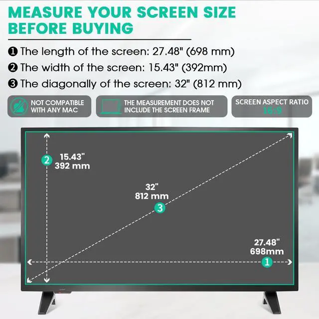 Compatible Model Length:27.48" (698 mm), Width: 15.43" (392 mm), Diagonal: 32" (812 mm). This 32 inch tv screen protector is specially compatible with 32" LCD, LED, OLED &QLED 4K HDTV With 16:9 Aspect Ratio. Please verify your tv screen's width and height measurements before ordering. It's not recommended to make your selection based solely on your tv screen's diagonal size