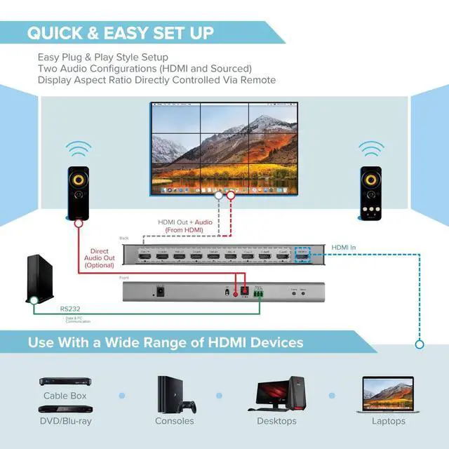 Plug & Play: No driver needed. ^^ 13 Display Modes - 1x2, 1x3, 1x4, 2x1, 2x2, 2x3, 2x4, 3x1, 3x2, 3x3, 4x1, 4x2 provide extra diversities on the display options. Transmit HDMI signal for up to 100 feet without losing picture quality.