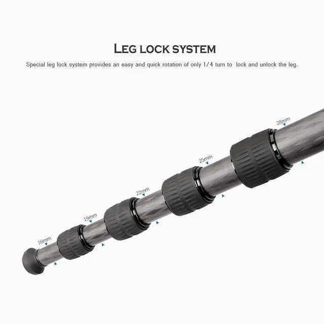 Twist Leg Lock System: Made up of durable 10-layer carbon fiber, the adds from 7.8" to 12.5" in height. Can be quickly deployed with a quarter turn ^^ Adjustable Range of