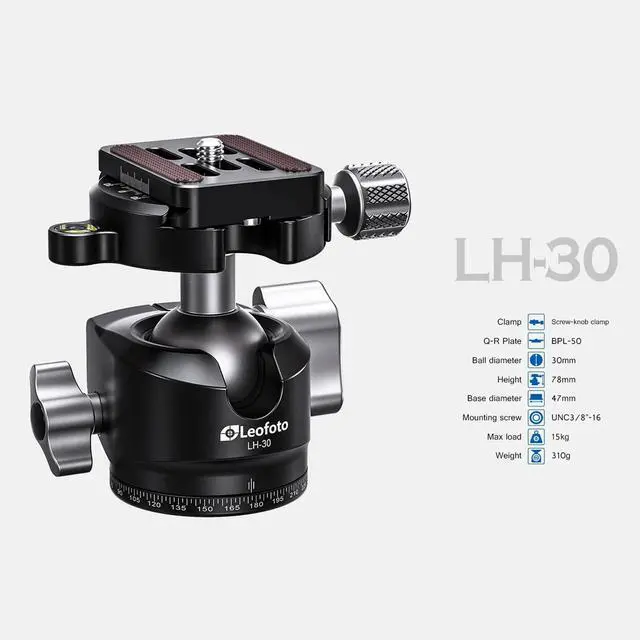 Included LH-30 Ballhead: This tripod with LH-30 Ballhead is lightweight aluminum and features an Arca-type compatible quick release system. Laser-engraved scales on the panning base provide precise control during panorama shooting and dual drop notches provide the capability for rapidly changing from horizontal to vertical orientation
