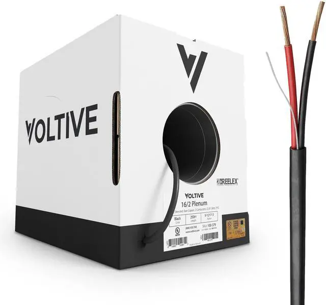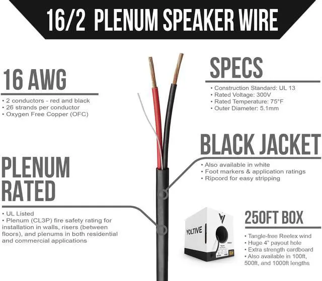 16AWG, 2 CONDUCTORS, BLACK JACKET, 250FT BOX. 16 gauge speaker cable, featuring 26 strand Oxygen-Free Copper conductors. Built to exacting standards with zero compromises. ^^ OXYGEN-FREE COPPER. Oxygen-free copper (OFC) conductors result in less signal loss and are more durable than conductors made of copper-clad aluminum (CCA). ^^ CL3P RATED. Plenum (CL3P) fire safety rating for installation in walls, risers (between floors), and plenums in both residential and commercial applications. UL Listed. ^^ TIME SAVING FEATURES. Patented winding technology & massive payout hole eliminate kinks and tangles.