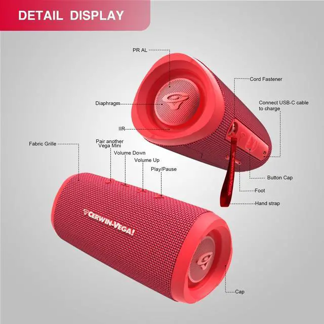 Professional-Grade Sound: Command attention with the Vega Mini's vibrant red finish while experiencing Cerwin-Vega! 's legendary audio quality through its powerful 20W RMS woofer and 10W tweeter system, delivering thunderous bass and sparkling highs in a compact, eye-catching package. ^^ Adventure-Ready
