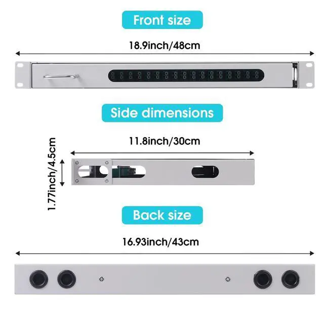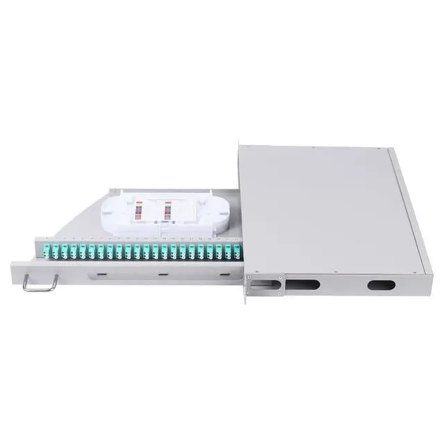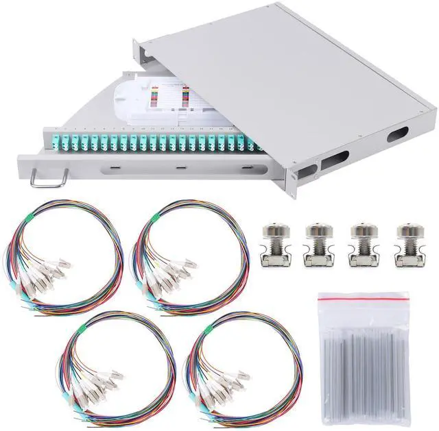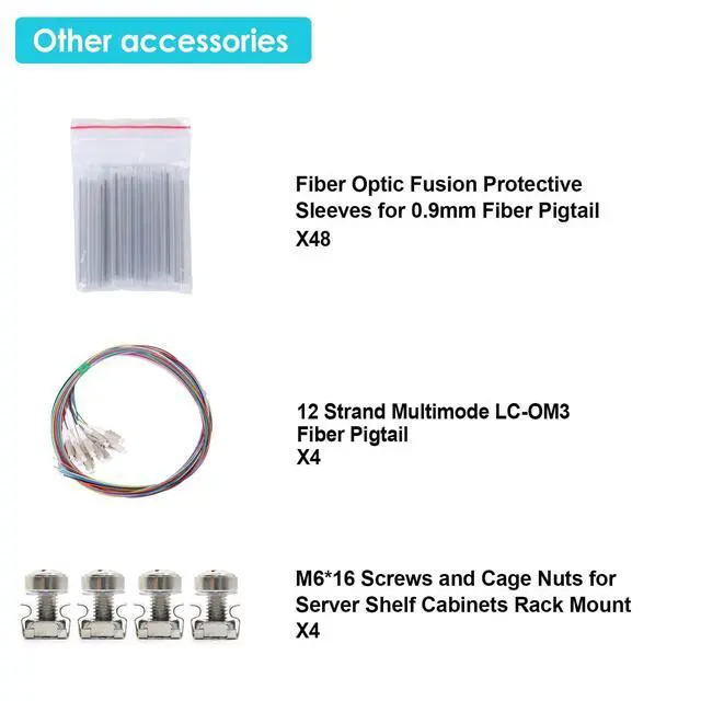 24 Duplex LC-OM3 Kit: Rack Mount Enclosure Box with Spool 48 Strands 1.2 m LC Pigtail, Fiber Type 0.9 mm 50/125 Multimode OM3; The rotating type design allows for quick installation and maintenance. No need to tighten screws.