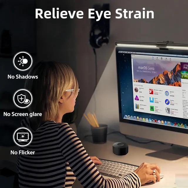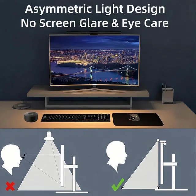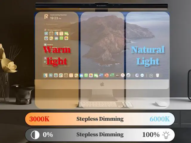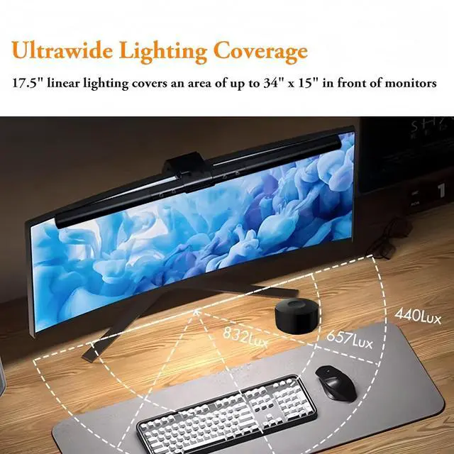 No Screen Glare and FlickerThe computer monitor bar features a scientific optical design. It only lights up the keyboard area and can effectively cut down screen reflection and glare. It has 108 high-quality LED lamp beads. It's energy-saving, emits soft and even light. Moreover, it reduces the hazards of blue light and protects the eyes from being damaged. ^^ Stepless Dimming & 3000-6000K Color TemperatureComputer light bar can be easily switched between 10 level brightness and 6 color temperatures (3000K-6000K) with a button or remote, and with a color rendering index 95, it can create more desktop atmosphere.