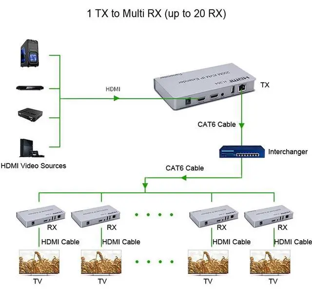 Introduction: This HDMI 200M Extender over IP is based on TCP/IP standard. It transmits your HD display with the high resolution up to 200M away from your DVD or computer source by using one CAT5e/6/6a/7 cable. At the same time, it's convenient to transmit HDMI audio and video source by point-to-point mode, one point-to-many mode and cascade connection mode. And support