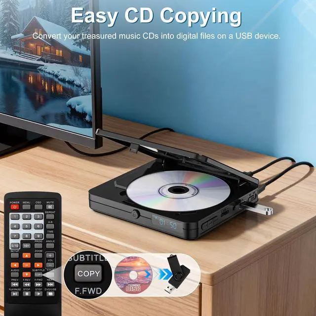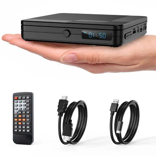 Note: Does not support Blu-ray Discs. ^^ HDMI Output for 1080P HD Viewing Designed as a perfect DVD player for smart TV and DVD player for projector, this mini DVD player hdmi connects instantly using the included cable. It upscales content to Full HD 1080P for a crisp, vivid picture, easily turning any room into your personal home theater. ^^ Headphone Jack Output This compact DVD-player features a dedicated headphone output jack, serving not only as a DVD player but also as a portable CD player for music on the go. Its exclusive volume control knob is designed for headphone use, letting you plug in and enjoy immersive sound directly from your CDs. ^^ Easy Music CD-to-USB Copy As a versatile DVD CD player for TV, it also features a built-in recording function. Simply insert a music CD and a USB driveno computer neededto directly convert your CDs into digital files, so you can take your music anywhere. ^^ Whats in the Box 1 x Mini DVD Player, 1 x HDMI Cable, 1 x USB Cable, 1 x Remote Control, 1 x User Manual.