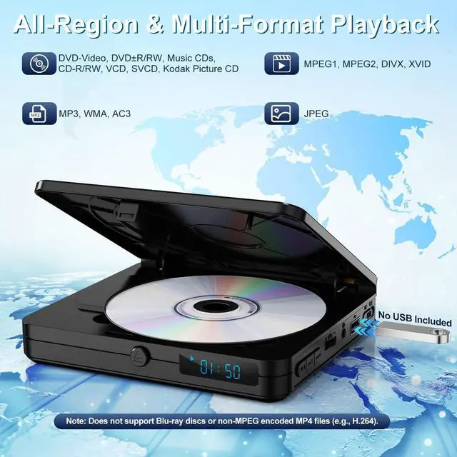Tip: Aim the remote at the sensor on the lower right front panel (effective up to 10 ft within 30). Batteries included are for testing; replace for regular use. ^^ Upgraded Drive with Memory Function This small DVD player for TV features an upgraded drive for fast, quiet disc reading with error correction for scratches. Its anti-shock mechanism and resume function ensure stable, uninterrupted playback. Combined, these technologies make it a reliable DVD player for TV, delivering a consistently immersive viewing experience. ^^ All-Region DVD/CD Playback & USB Input This true region free DVD player effortlessly supports DVDs and CDs from any region, including DVD-video, DVDR/RW, CD-R/RW, and music CDs. It also functions as a convenient USB DVD player, with a port for playing MP3 music, JPEG photos, and compatible videos (MP4/VOB/AVI in MPEG encoding only; H. 264/MPEG-4 AVC is unsupported). For best results, use USB video files around 480p resolution.