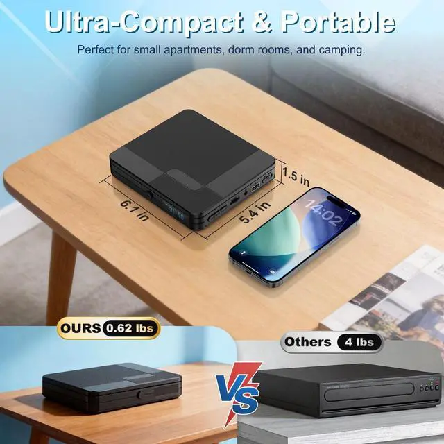 Mini DVD Player with Remote Control This mini DVD player redefines portability among standard DVD players, with an ultra-compact DVD player design measuring just 6.15. 41.2 inches and weighing 0.62 lbs. Its space-saving build fits seamlessly in small apartments, dorms, or travel kits. Operate menus and playback from your couch with the included remote and clear manual.