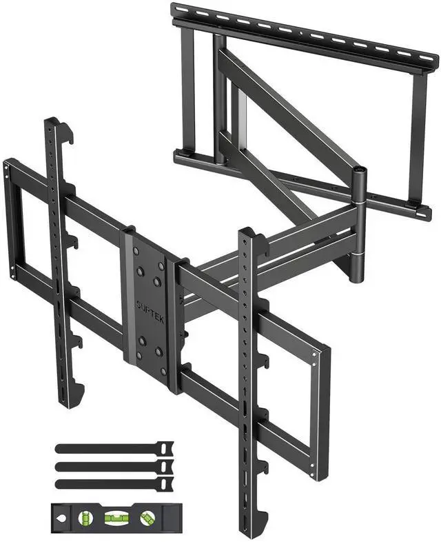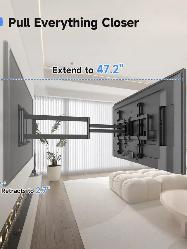 ^^ [Long Extension & Flexible Positioning] Enjoy ultimate placement freedom with an articulating arm that extends from a compact 2.7 to a full 47.2 from the wall. This super long reach allows you to cover multiple viewing areas, perfectly position your TV over a fireplace, or seamlessly install it in a corner for the optimal layout. ^^ [Secure & Simplified Installation] Installation is straightforward with our detailed instructions, labeled parts, pre-assembled sections, and a handy mounting template. The package includes all necessary hardware for 16"-24" wood studs, concrete anchors for solid walls, and Velcro straps for cable management.