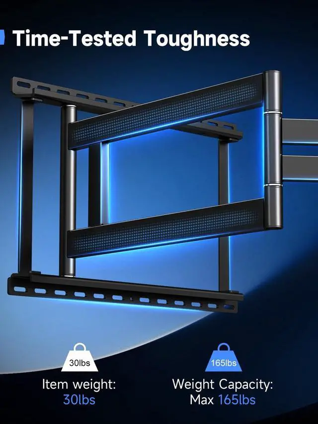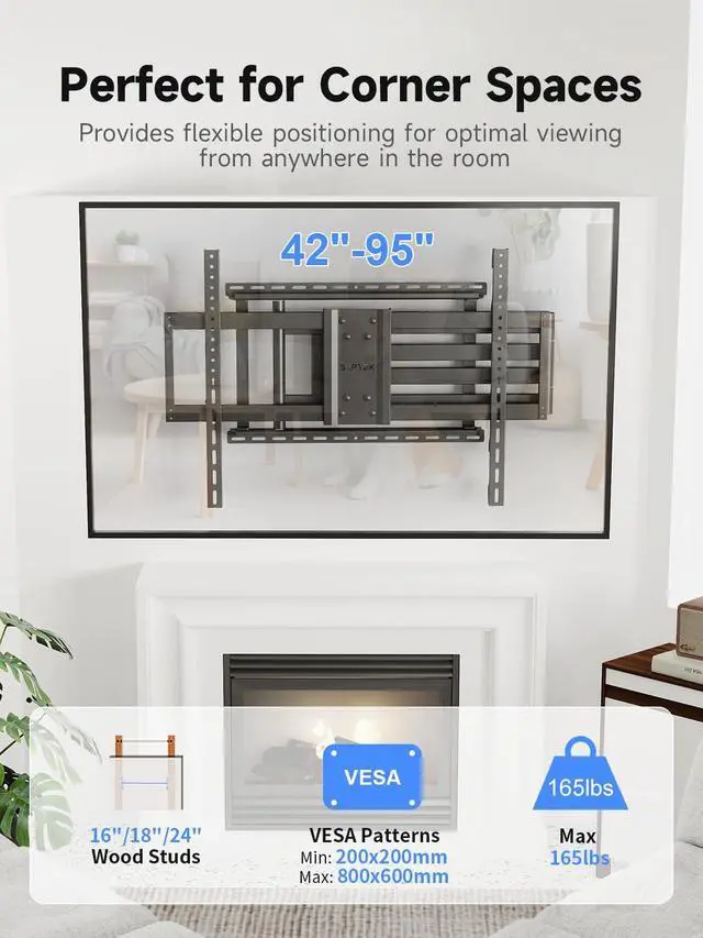 [Maximum Compatibility & Strength] This heavy-duty long arm TV mount is designed for most 42-95 inch TVs, supporting up to 165lbs. It features extensive VESA compatibility from 200x100 to 800x600mm and securely fits 16", 18", 20", and 24" wood stud spacing, ensuring a perfect match for your setup. ^^ [Superior Viewing Comfort & Adjustment] Achieve the ideal viewing angle with our advanced motion system. The mount offers 10 tilt to eliminate glare, 90 swivel, and 5 leveling adjustment for maximum flexibility. Three quick-release hook positions allow for easy vertical height adjustment, enabling you to find the most comfortable and satisfying viewing position in any room.